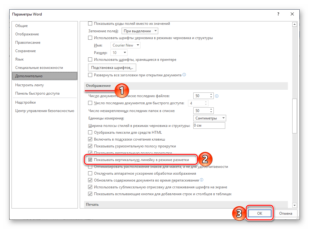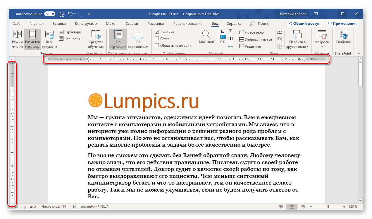 - После того как вы измените указанный выше параметр и нажмите «ОК» для подтверждения своих действий, в текстовом документе будет отображаться не только горизонтальная, но и вертикальная линейка.