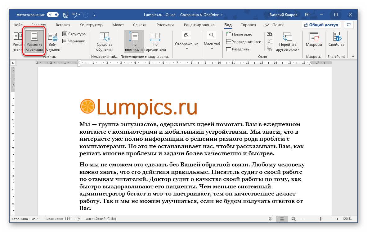 Если изменение масштаба не помогает решить проблему и на верхней панели нет крестика для закрытия полноэкранного режима, значит, необходимо перейти во вкладку «Вид» и посмотреть, какой режим просмотра документа включен. Нажать на кнопку «Разметка…».