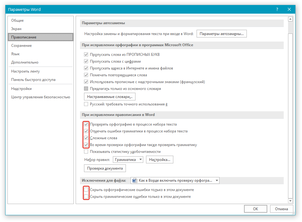 4. Установите все галочки в пунктах раздела “При исправлении правописания в Word”, а также уберите галочки в разделе “Исключения для файла”, если таковые там установлены. Нажмите “ОК”, чтобы закрыть окно “Параметры”.