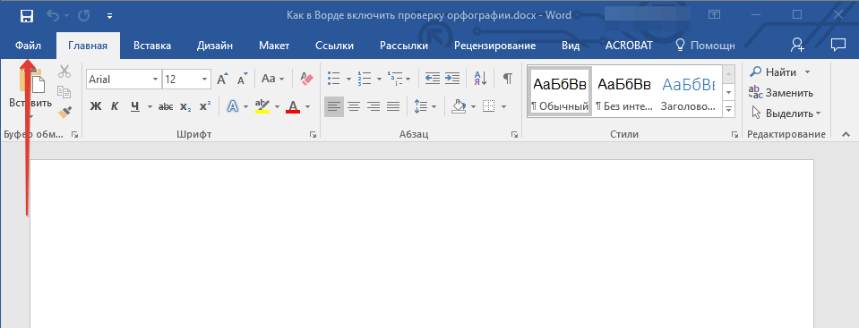 Включение проверки орфографии в Ворде