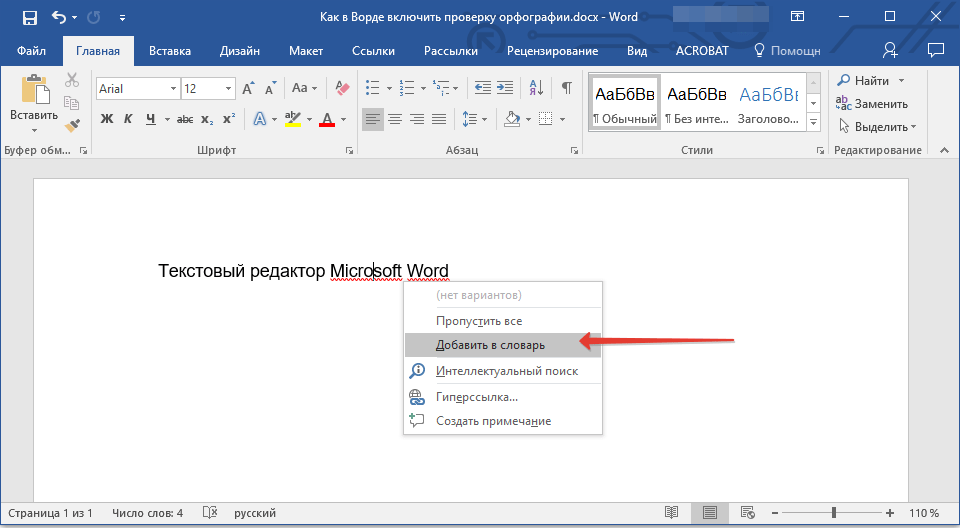 Для того чтобы добавить «правильное», но все же подчеркнутое слово в базу программы, тем самым убрав из-под него линию, кликните на нем правой кнопкой мышки, а затем выберите пункт «Добавить в словарь». При необходимости вы также можете «Пропустить все», то есть исключить проверку данного слова — это тоже уберет подчеркивание.