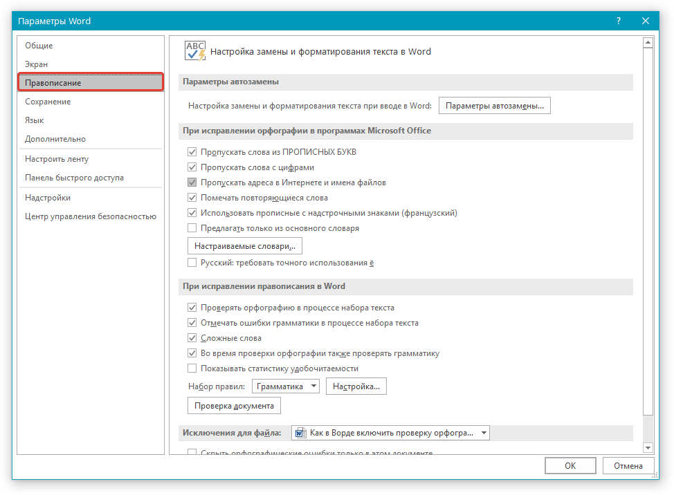 Настройка проверки правописания в Ворд