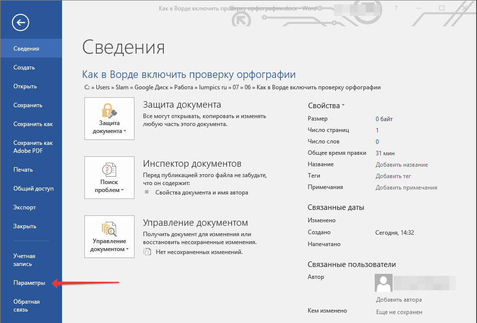 Настройки по проверке орфографии находятся во вкладке «Файл» → «Параметры».