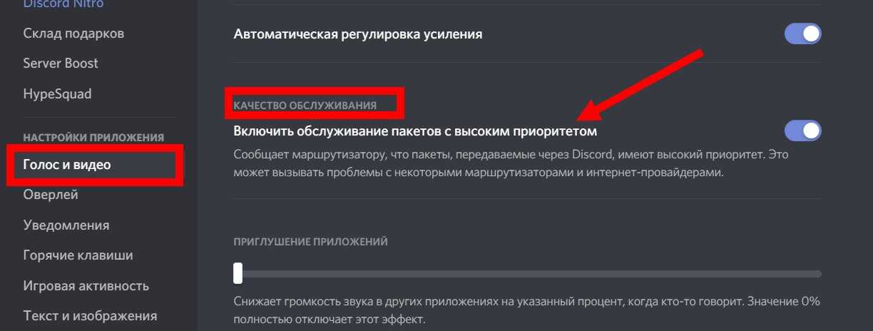 - Войдите в настроечный раздел, Голос и видео, а там переведите тумблер Включить обслуживание пакетов с высоким приоритетом в левую сторону.