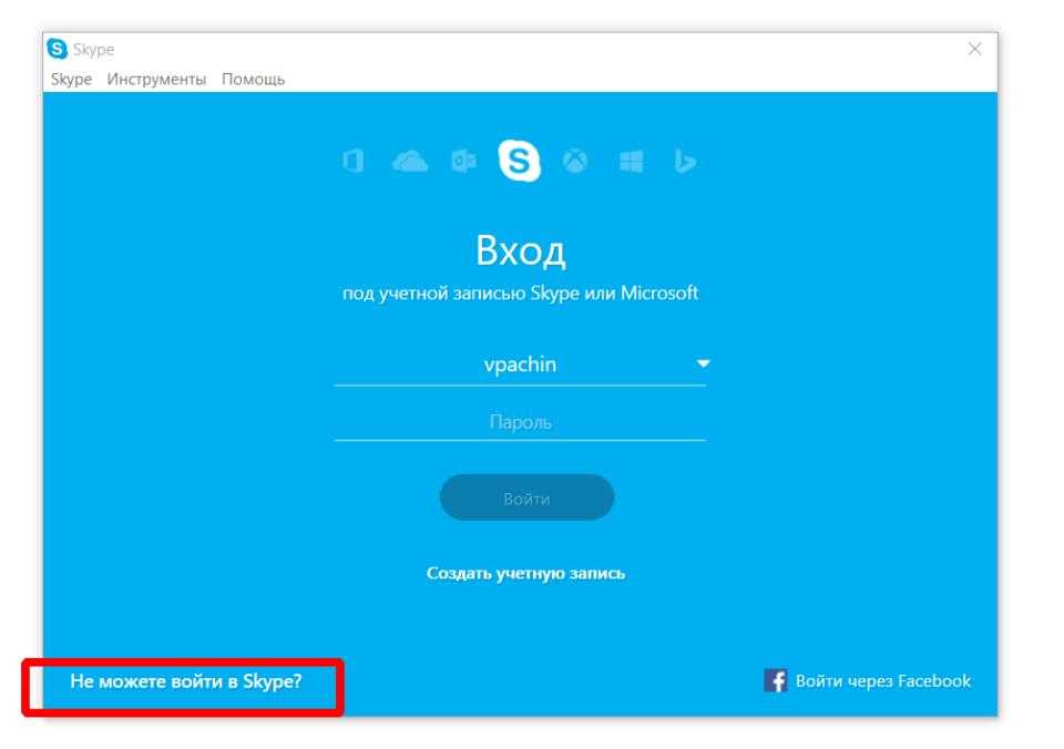 - Найти на странице входа в программу надпись «Не можете войти в Skype?». Нажать ее.