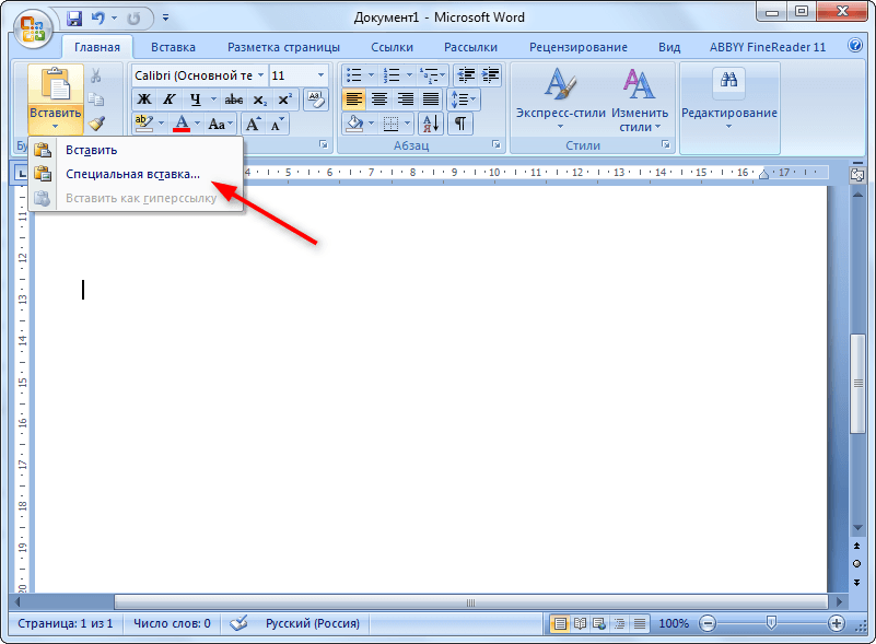 2. Запустите Microsoft Word. На вкладке «Главная» нажмите большую кнопку «Вставить». Выберите «Специальная вставка».