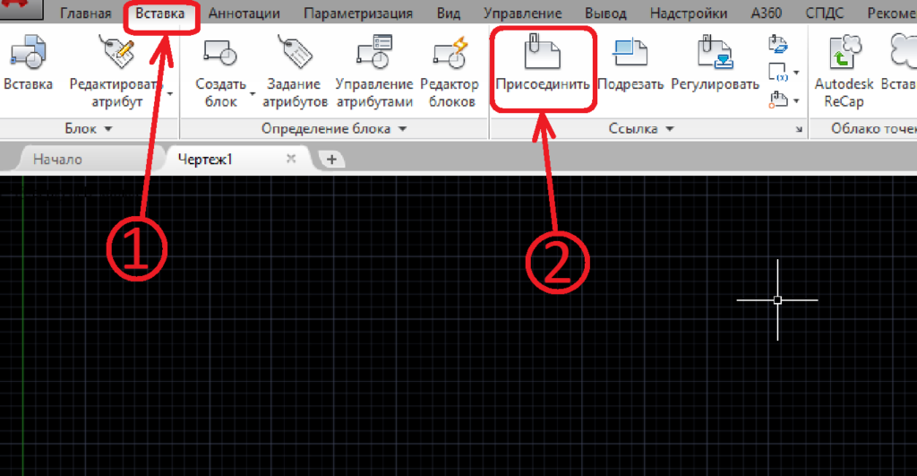 - Кликнуть по надписи «Вставка» в главной ленте Автокада.