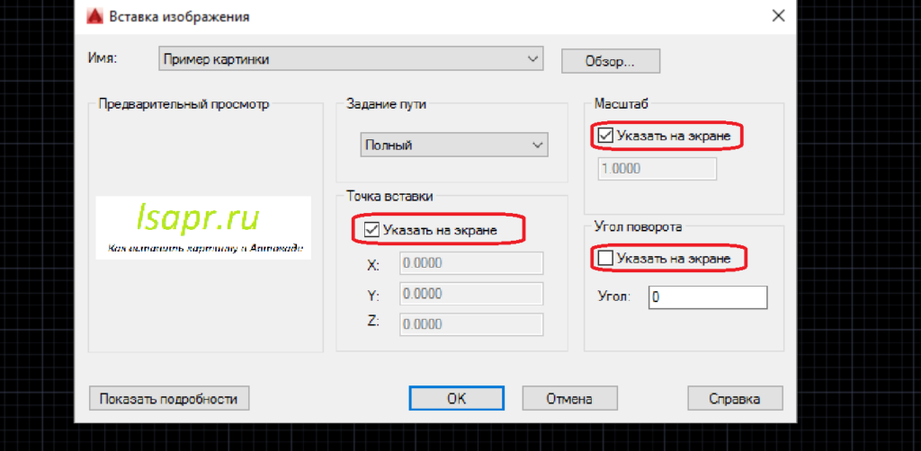 Слева отображается предварительный просмотр вставляемой картинки Автокад. По центру окна две области настройки вставки картинки «Задание пути» и «Точка вставки».