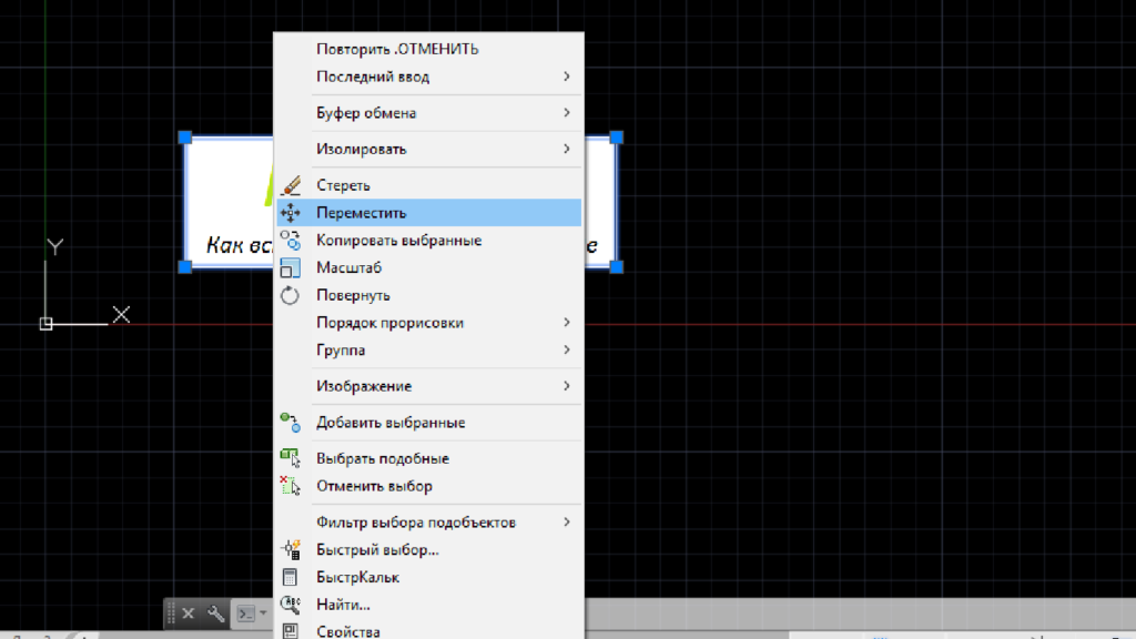 Мы разобрались, как вставить картинку в чертеж Автокад. Но что делать, если допустили ошибку в масштабе или точке вставки? Бесполезно щелкать по картинке кнопками мышки. Можно конечно отменить вставку и попробовать снова, но лучше отредактировать уже вставленное изображение и исправить ошибки. Необходимо выделить объект. Курсор мыши располагаем в свободном месте правее, ниже картинки или выше, но не слева от нее, нажимаем левую кнопку мыши, и, не отпуская кнопку, ведем на изображение. Как только навели на картинку, отпускаем кнопку. Чтобы выделить картинку движение курсора обязательно должно быть справа налево. При правильно выделении появятся квадратики по углам объекта, и откроется меню его редактирования.