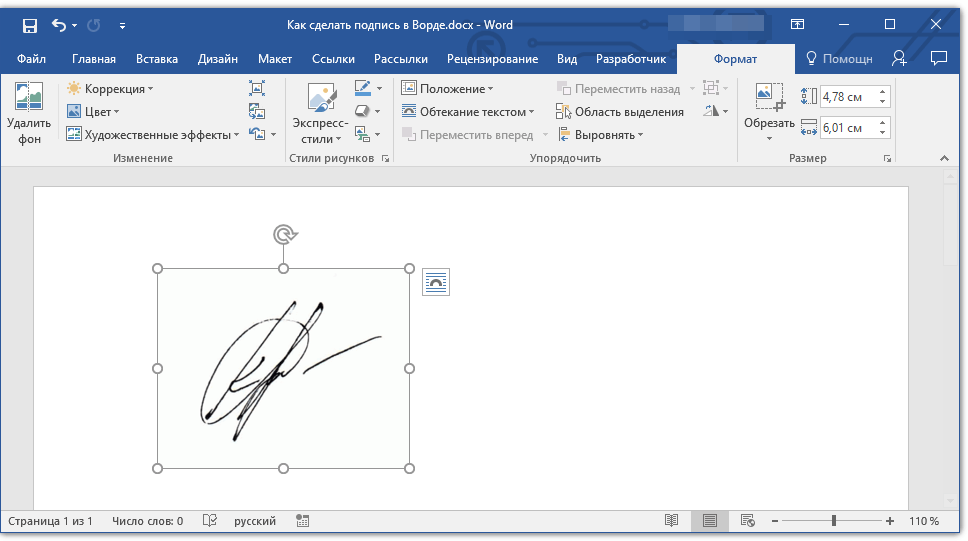 Соответственно ставите подпись над чертой. Можно добавить картинку из Способа №1, предварительно сохранив её на компьютере, при помощи настроек. И тогда получится вот так: