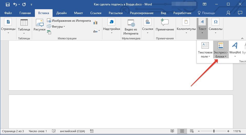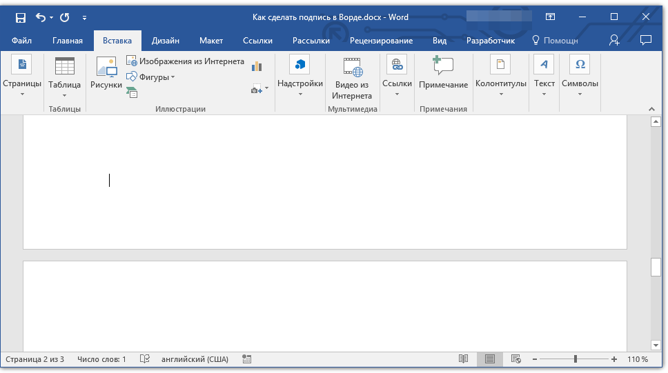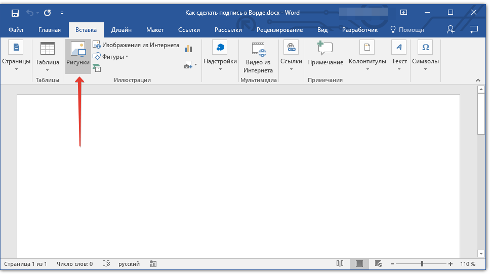 Чтобы добавить подпись в документ, на вкладке Вставка нажмите кнопку Рисунки.