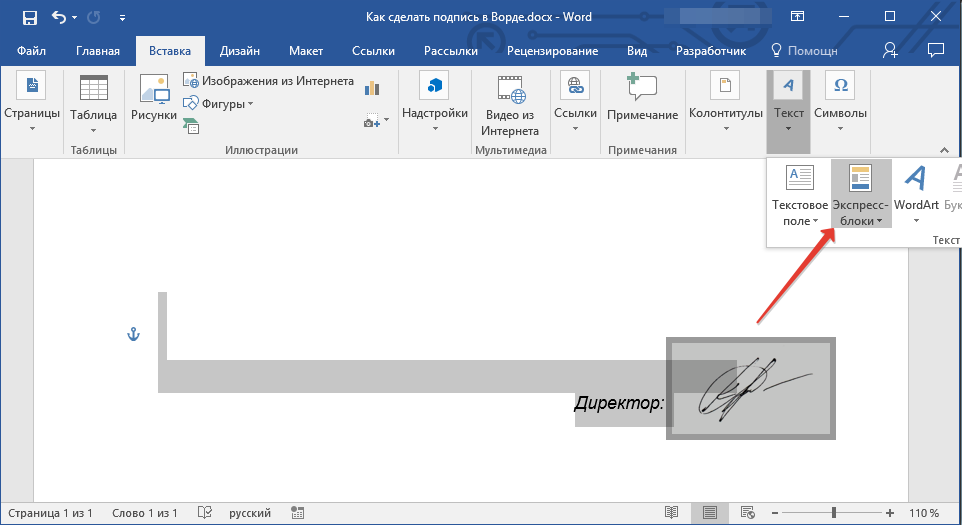 Чтобы сделать электронную подпись внизу текста в word существует два пути:
