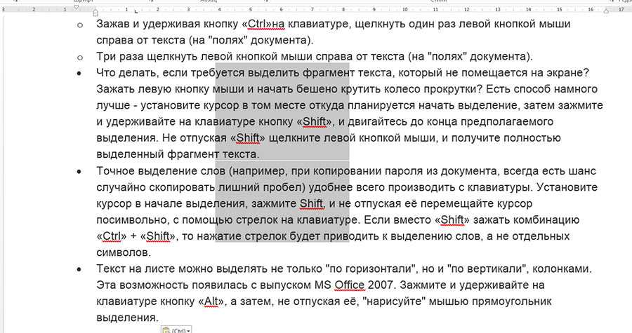 - Воспользуйтесь сочетанием клавиш Ctrl+Shift+стрелка вверх/вниз. Выделение в таком случае будет происходить по абзацу, поэтому вы можете выделить чуть больше или меньше необходимого текста. Это очень удобно, если вам нужно выделить не всю страницу, а лишь определенный отрезок текст, который занимает примерно одну страницу.
