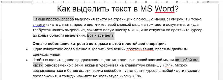 Самый простой способ выделения текста на странице – с помощью мыши. Я уверен, вы точно знаете как это делать: просто щелкните левой кнопкой мыши в том месте документа, откуда требуется начать выделение, зажмите левую кнопку мыши, и не отпуская её протяните курсор до конца области выделения. Вот и все дела!