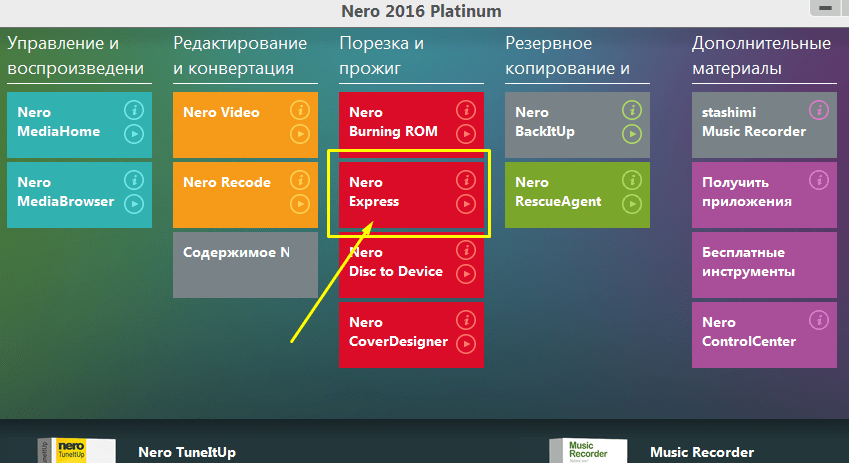 3. После того, как программа установится, пользователю необходимо ее запустить. Откроется основное меню программы, предоставляющее доступ к модулям, имеющим свое назначение. Из всего списка нас интересует один — Nero Express. Нажимаем на соответствующую плиточку.