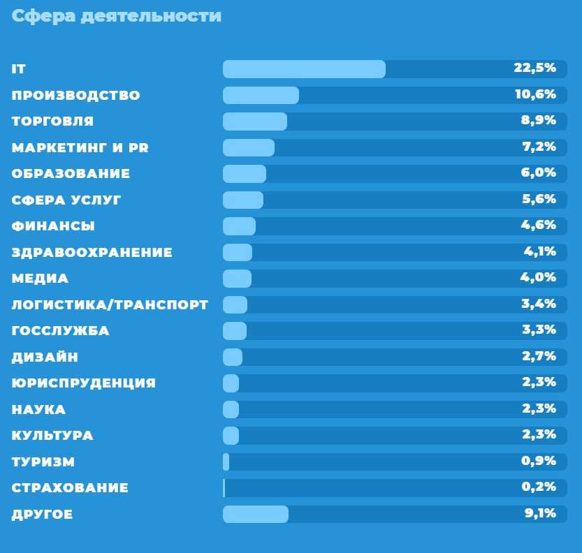 Самым частым пользователем приложения является IT-специалист (22,5%) с высшим образованием и заработком выше среднего. Многие клиенты сервиса трудятся на производстве (10%), в торговле (8,9%) и маркетинге (7,2%). Меньше всего платформа нравится работникам культуры (2,3%), науки (0,9%) и туризма (0,2%).