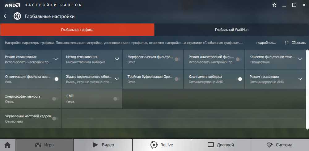 Внешний вид приложения в чем-то похож на AMD Catalyst, хотя и различий хватает. Для установки требуемых параметров графики нужно переключиться на вкладку «Дисплей», «Видео» или «Игры», где легко сделать тонкую настройку устройства. А на вкладке «Система» можно посмотреть набор микросхем и объем памяти видеокарты.