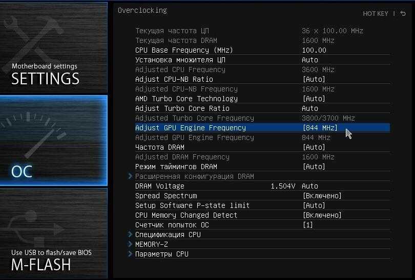 В этом меню в графе «Adjust GPU Engine Frequency» мы выставим частоту графического процессора 844 МГц, после чего сохраним настройки БИОСа и перезагрузим компьютер. В нашем случае нам удалось заставить работать видеокарту Radeon HD 7540D через БИОС стабильно на частоте 844 Мгц.