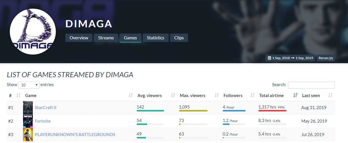 За последние 12 месяцев Dimaga стримил только 3 игры, и по показателям количества зрителей и фолловеров в зависимости от игры, можно увидеть невооруженным взглядом, что основной костяк его зрителей составляют именно фанаты Starcraft 2. Когда Dimaga стримил Fortnite или PUBG, то эти трансляции смотрело минимальное количество зрителей.