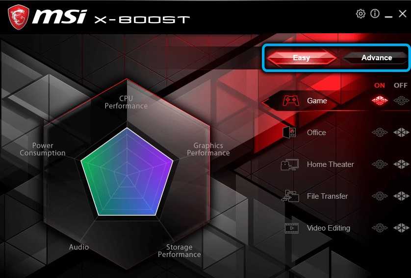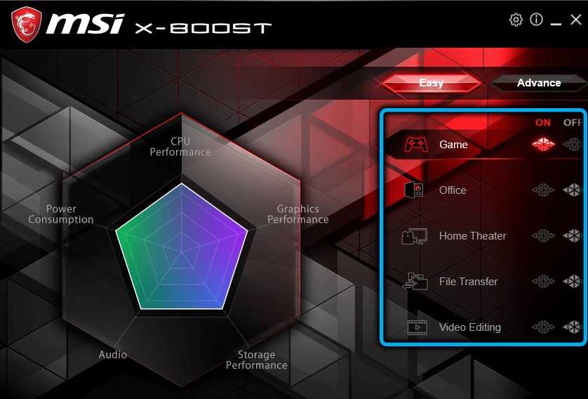 При активации режима Easy (текущий активный режим можно опознать по красному цвету кнопки) вам предоставляется возможность выбора одного из готовых пресетов, оптимальных по производительности системы для данного набора оборудования и предпочитаемого режима использования программного обеспечения. Так, пресет Game будет оптимальным при запуске игр, пресет Office хорош для работы документов. Любителям просмотра видео высокого качества стоит попробовать пресет Home Theater. Тем, кто часто редактирует видео, рекомендуется режим Video Editing, а при массовых операциях копирования стоит выбрать File Transfer.