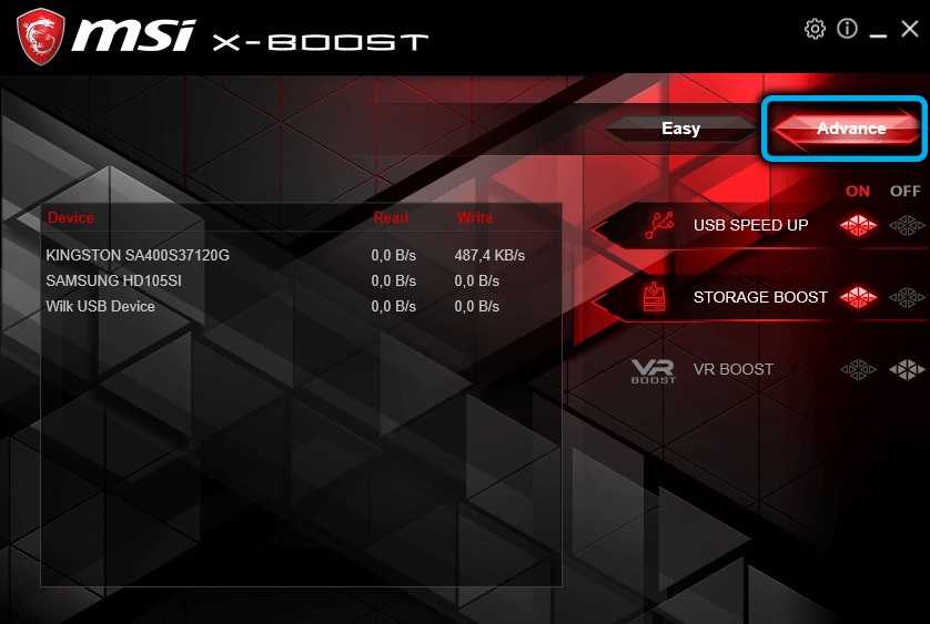 Нажав на кнопку Advance, вы получите возможность увидеть все подключённые к компьютеру накопители (в этой же панели отображается их текущая скорость чтения/записи данных), а также получить доступ к расширенным настройкам, расположенным справа.