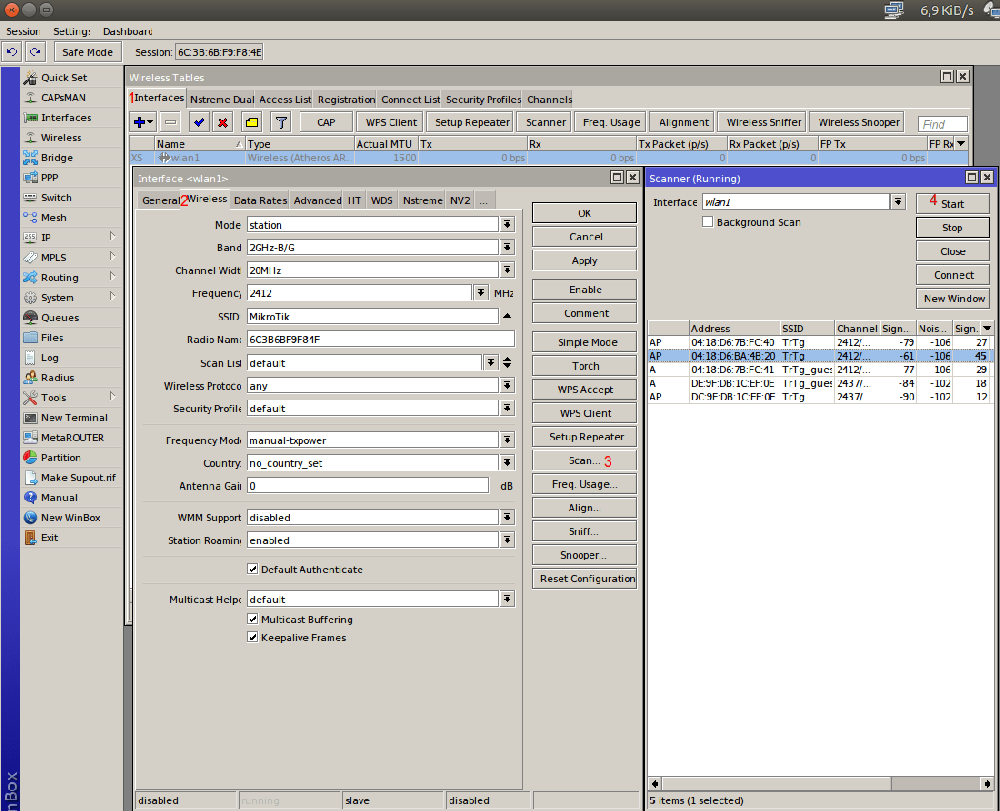 Выполняем подключение к сети: открываем вкладку «Interfaces» и двойным кликом открываем настройки сетевого интерфейса; там открываем вкладку «Wireless» и нажимаем кнопку «Scan». Затем нажимаем кнопку «Start». Когда в поле ниже отобразятся сети Wi-Fi, выберете левой кнопкой вашу сеть и нажмите «Connect». После этого необходимо проверить, чтобы устройство работало в режиме station-bridge (Mode = station bridge).