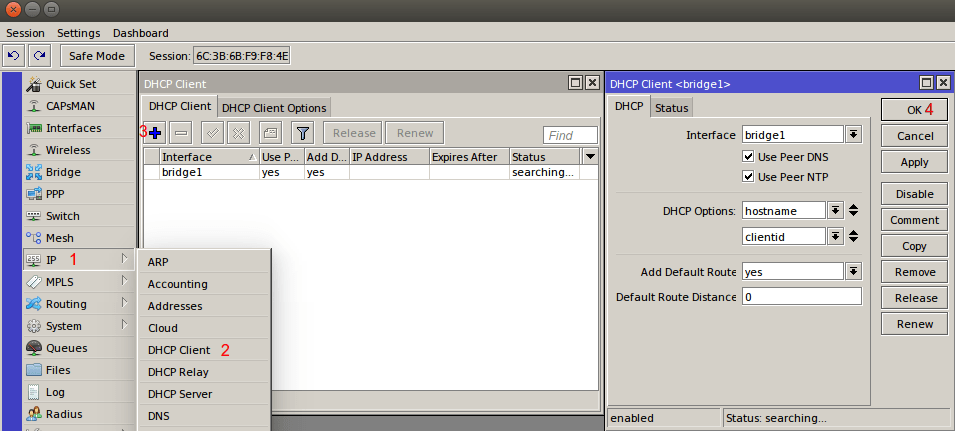 Теперь необходимо, чтобы устройство получало настройки сети (адрес, ДНС, шлюз), от нашего центрального маршрутизатора. Для этого мы включаем функцию DHCP-client на интерфейсе созданного бриджа: открываем IP→DHCP Client и нажимаем «Добавить». Необходимо убедиться, что в поле «Interface» выбран интерфейс созданного бриджа.