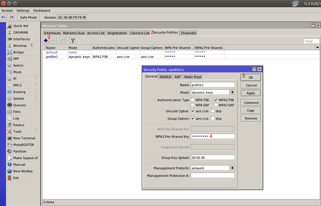 Далее осуществляем подключение нашего устройства к общей сети. Для этого, для начала, нужно указать ключ, который необходим для подключения к Wi-Fi: открываем слева меню «Wireless», вкладку «Security Profiles» и добавляем новый профиль безопасности. В профиле необходимо заполнить поле с ключем и выбрать режимы безопасности актуальный для настроек подключения к вашей сети.