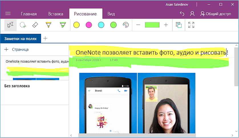 Также вы можете делать в OneNote быстрые вставки из фото, видео или аудиозаписей. В любой момент можно отредактировать запись рукописным текстом или разноцветным рисунком, что очень удобно делать на планшетах и смартфонах.