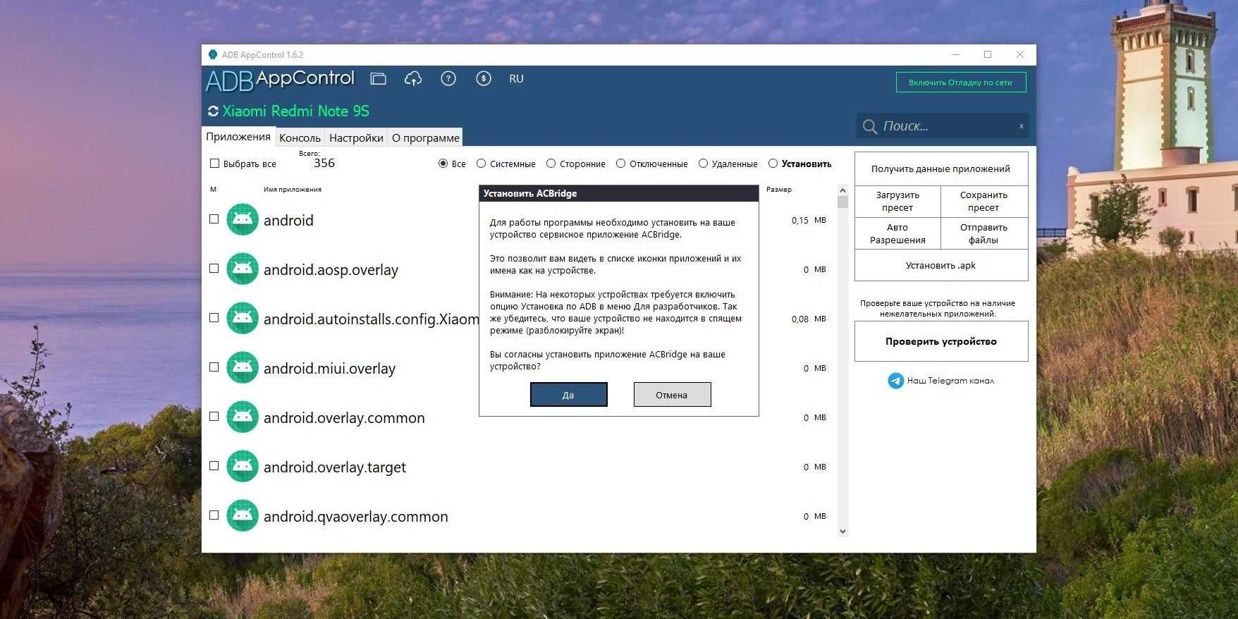 Программа ADB App Control может попросить установить дополнительное приложение на ваш смартфон. Оно не обязательно, но позволяет отображать иконки и названия приложения, а не имена пакетов. Поэтому разблокируйте экран смартфона, если его отключили, и нажмите «Да» в окне ACBridge.