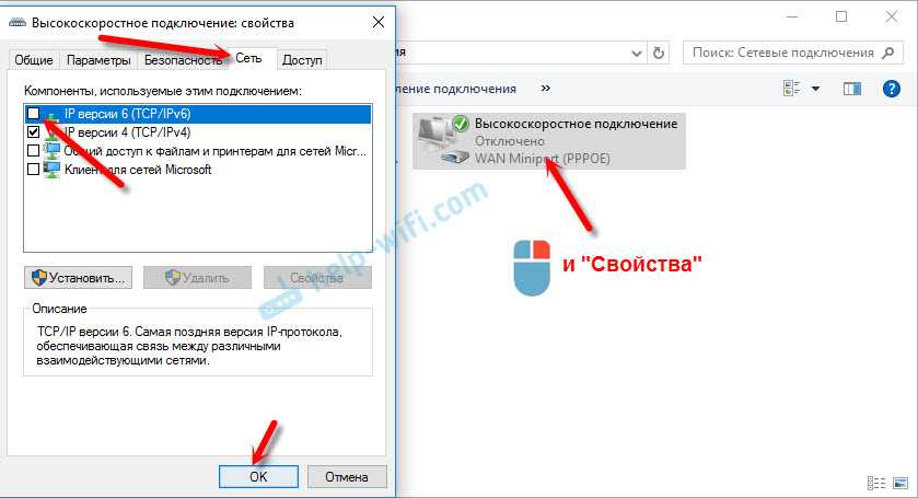 Отключаем протокол TCP/IPv6 в свойствах PPPoE подключения