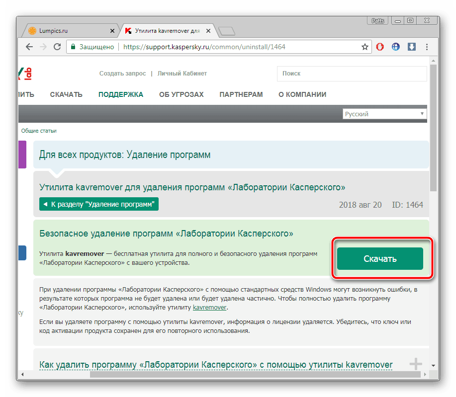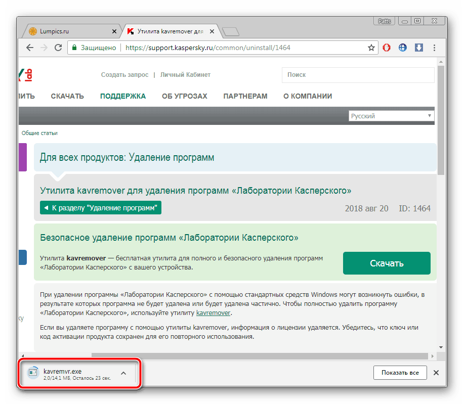 Если при установке антивирусных продуктов Kaspersky появляется сообщение, что в системе установлены другие продукты этого разработчика, мешающие установке, воспользуйтесь утилитой «Kavremover», специально созданной для удаления программ «Лаборатории Касперского». Перейдите на страницу приложения на официальном сайте и нажмите кнопку «Скачать».