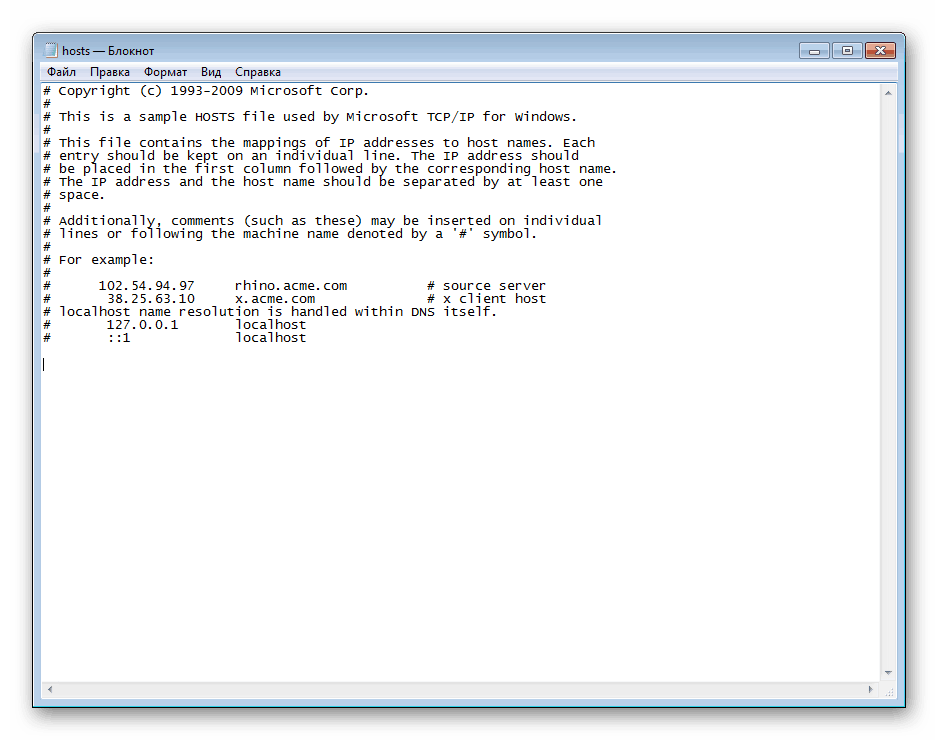 Откройте этот файл с помощью Блокнота. Проверьте, чтобы содержимое не отличалось от того, что указано на скриншоте ниже. Если присутствуют несоответствия, удалите лишнее, после чего сохраните изменения и закройте Блокнот.