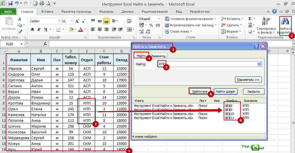Совет: Когда вы нажимаете кнопку найти все, выводится каждое вхождение условия, которое вы ищете, и щелчок по определенному вхождению в списке выберет ячейку. Чтобы отсортировать результаты поиска ” найти все “, щелкните заголовок столбца.