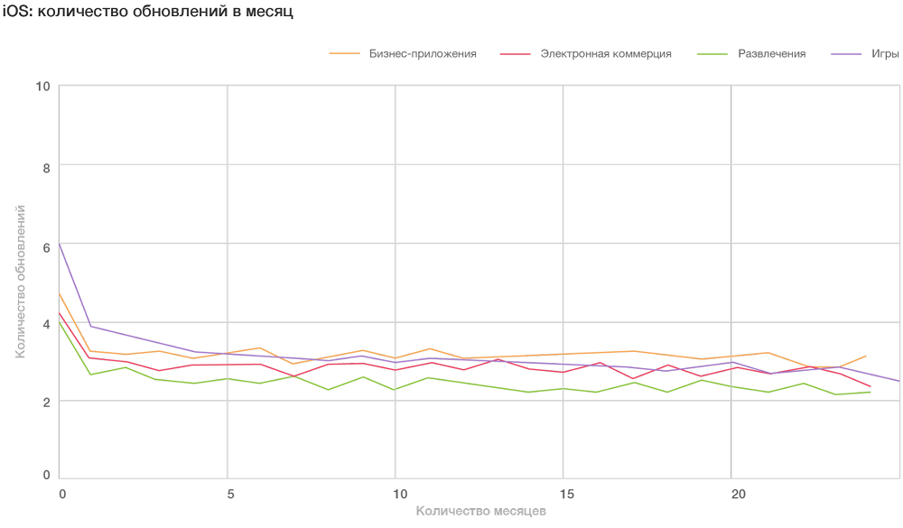 Графики обновлений приложений популярных категорий показывают, что со времени первого релиза приложения количество обновлений идёт на спад с каждым месяцем.