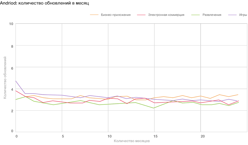 Среднее количество обновлений для действующего приложения — три в месяц.
