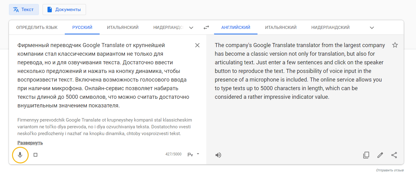 Фирменный переводчик от крупнейшей компании стал классическим вариантом не только для онлайн-перевода, но и для озвучки набранного текста. Достаточно ввести несколько предложений и нажать на кнопку динамика, чтобы воспроизвести текст. Включена возможность голосового ввода при наличии микрофона. Веб-сервис позволяет набирать тексты длиной до 5000 символов, что можно считать достаточно внушительным значением показателя.