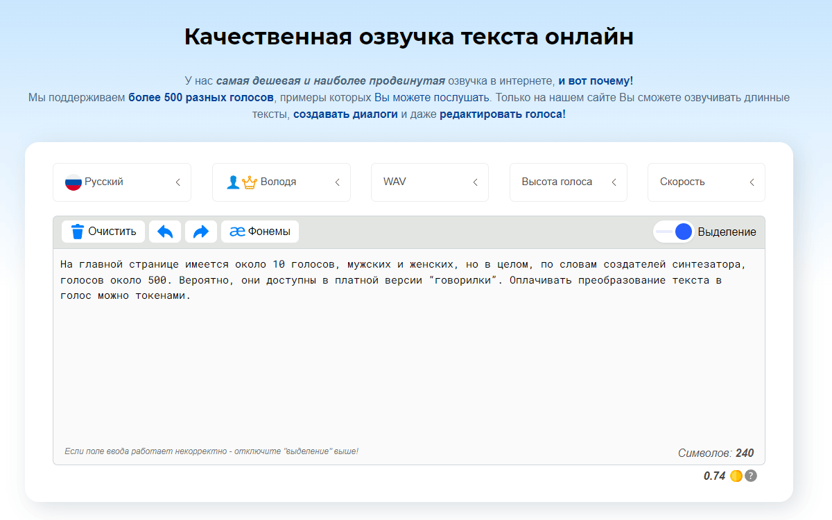 На главной странице имеется около 10 голосов, мужских и женских, но в целом, по словам создателей синтезатора, голосов около 500. Вероятно, они доступны в платной версии “говорилки”. Оплачивать преобразование текста в голос можно токенами.