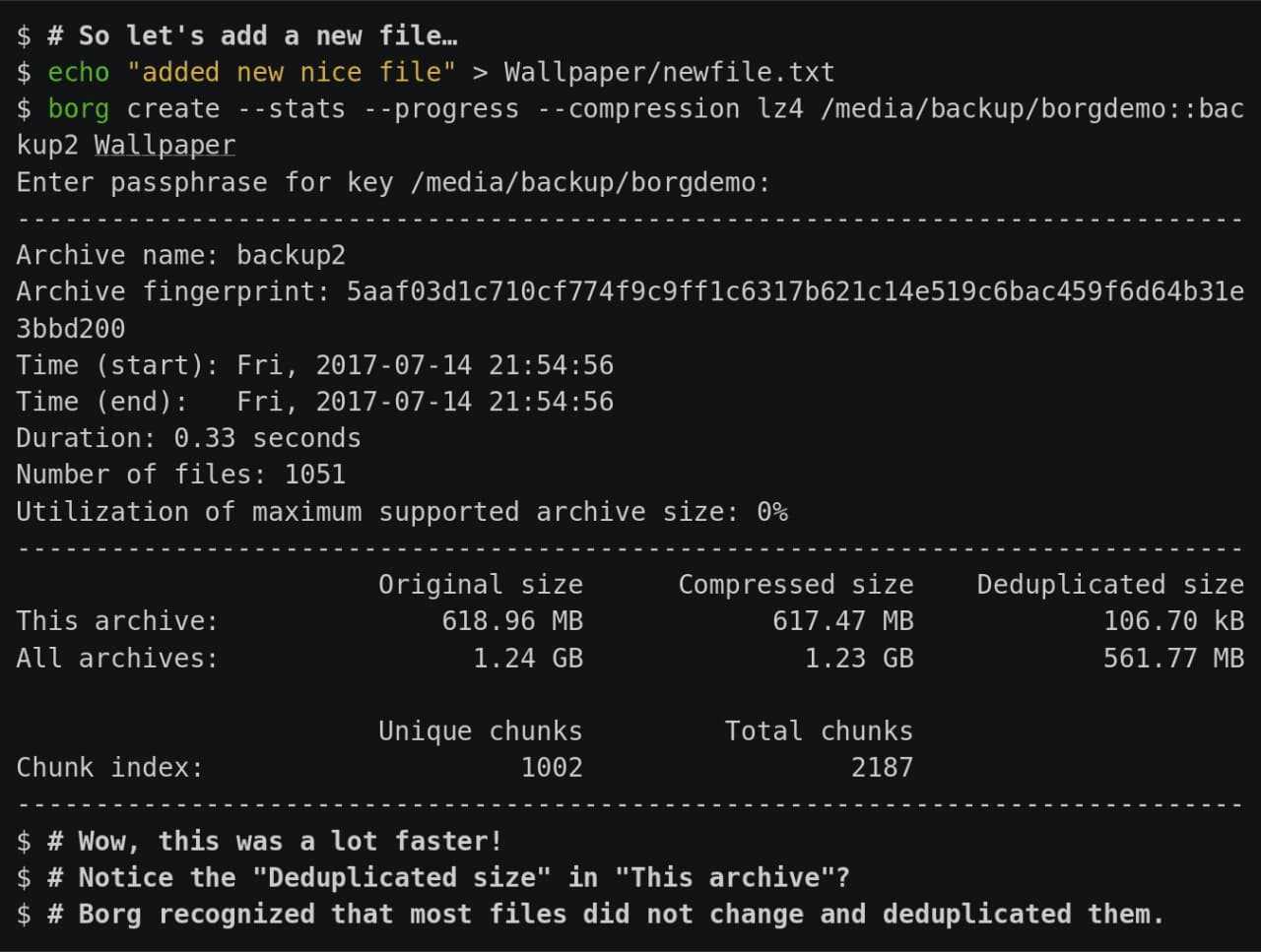 Если вас реально заинтересовал Borg, то посмотреть, как он работает, можно тут — https://www.borgbackup.org/demo.html Сразу получите практически полное представление о его работе. Я начал с того, что посмотрел все 4 demo ролика.