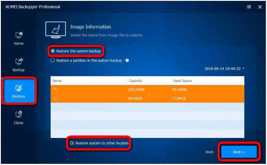 Далее нужно перенести файл копии (или все его части) на другой компьютер. И уже на другом компьютере, установив AOMEI Backupper, можем приступать к восстановлению системы. Если на другом компьютере нет своей установленной Windows, можем на компьютере исходном создать загрузочный носитель с программой и восстановить систему с его помощью.
