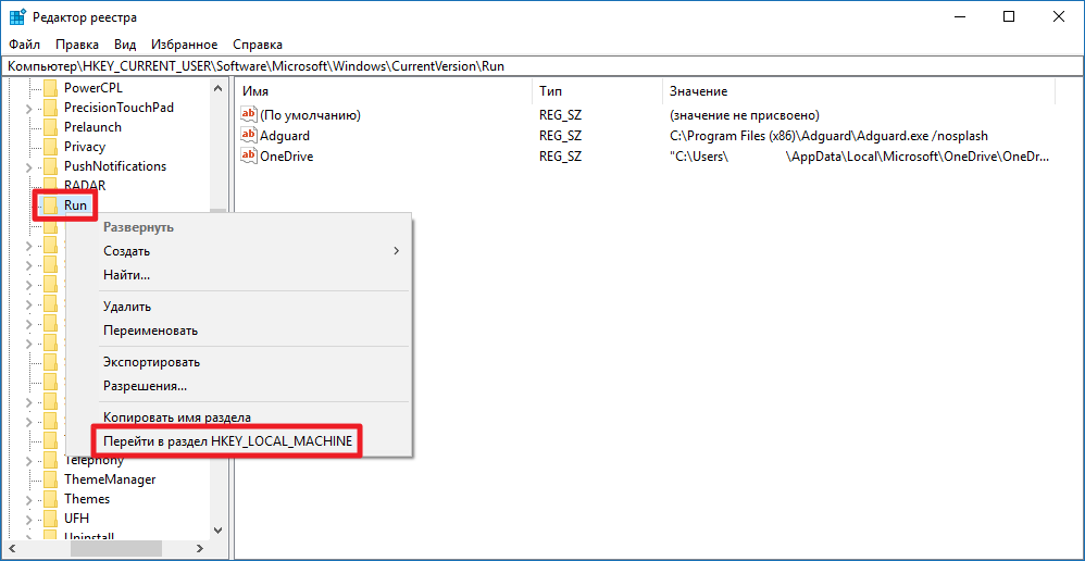 Здесь хранится информация о приложениях, которые автоматически запускаются для текущего пользователя. Некоторые программы загружаются для всех пользователей, и данные о них размещены в ветви HKEY_LOCAL_MACHINESOFTWAREMicrosoftWindowsCurrentVersionRun. Чтобы быстро переключиться между этими директориями, достаточно кликнуть правой клавишей мыши по папке Run и выбрать пункт Перейти в раздел HKLM/HKCU.