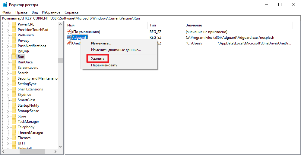 Чтобы удалить программу из автозапуска, кликните по соответствующему ключу и выберите пункт Удалить.