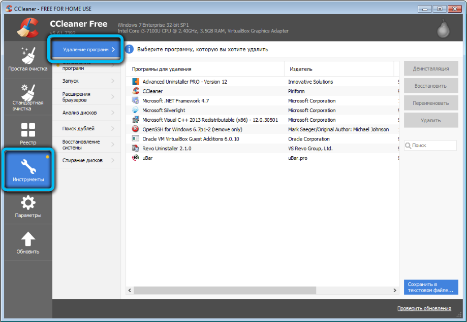 С помощью специального софта, например, CCleaner или прочих сторонних инструментов, посредством которых доступно управление компонентами, также можно отключить или удалить Sidebar. Так, утилита CCleaner позволяет не только убрать панель, но также почистить реестр после удаления, чтобы не оставалось никаких хвостов софта.