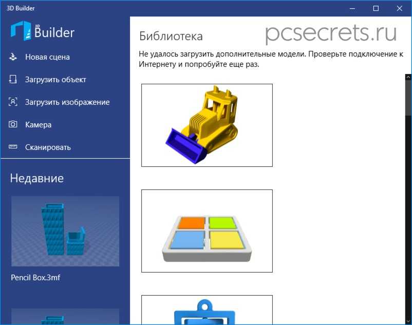 - выбор 3D-модели, готовой для 3D Builder, из специальной библиотеки;